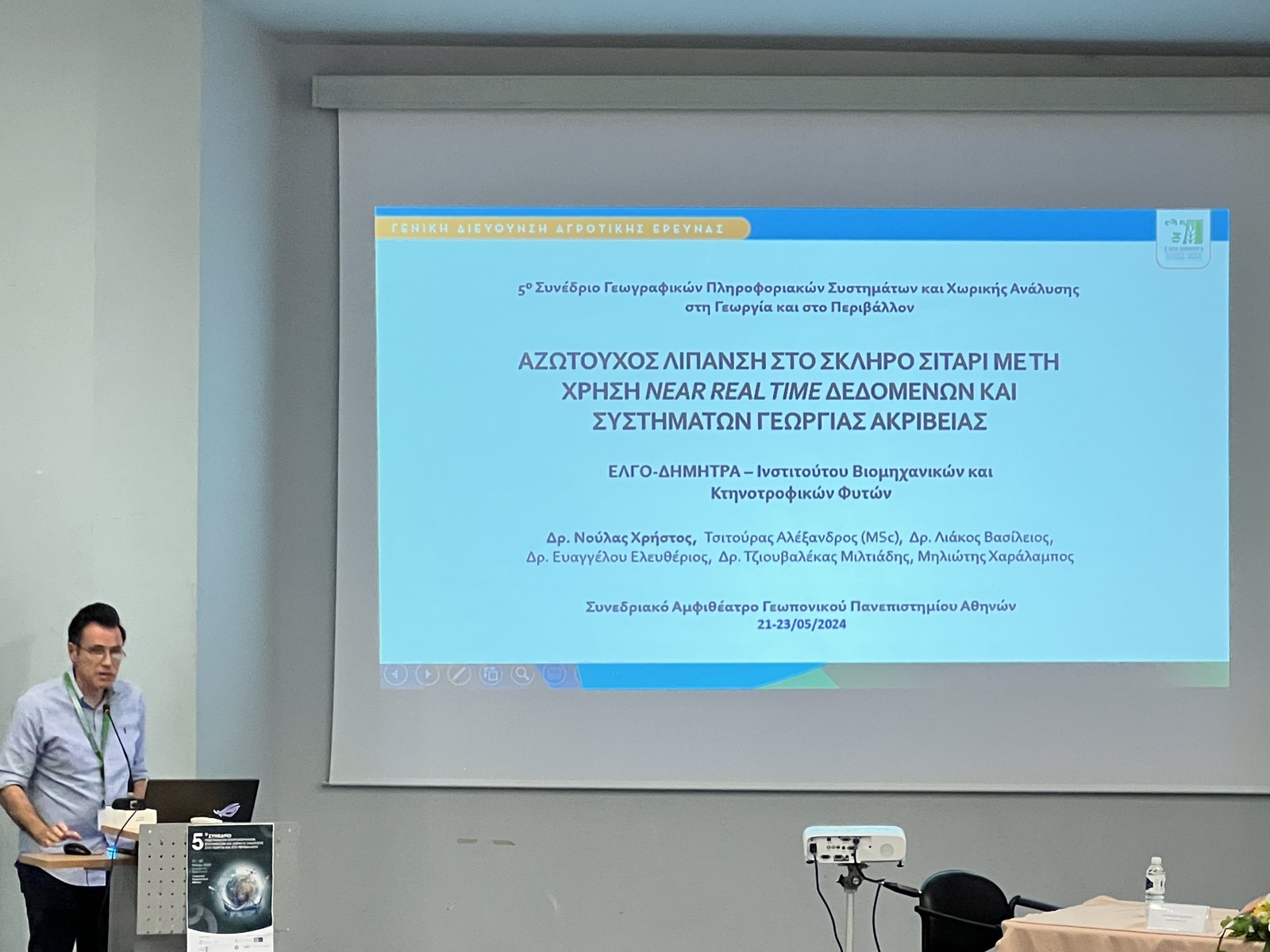 Στις 21-23 Μαΐου 2024 πραγματοποιήθηκε το 5ο Συνέδριο Γεωγραφικών Πληροφοριακών Συστημάτων και Χωρικής Ανάλυσης στη Γεωργία και στο Περιβάλλον που διοργανώθηκε από την Ερευνητική Μονάδα Γεωγραφικών Πληροφοριακών Συστημάτων (GIS) του Γεωπονικού Πανεπιστημίου Αθηνών και την Ελληνική Εταιρεία Γεωγραφικών Συστημάτων Πληροφοριών (Hellas GIS). Στο πλαίσιο του συνεδρίου παρουσιάστηκαν μέσω δυο εργασιών αποτελέσματα του προγράμματος ΣΙΤΑΡΙ ΑΚΡΙΒΕΙΑΣ (https://www.smartwheat.gr/).